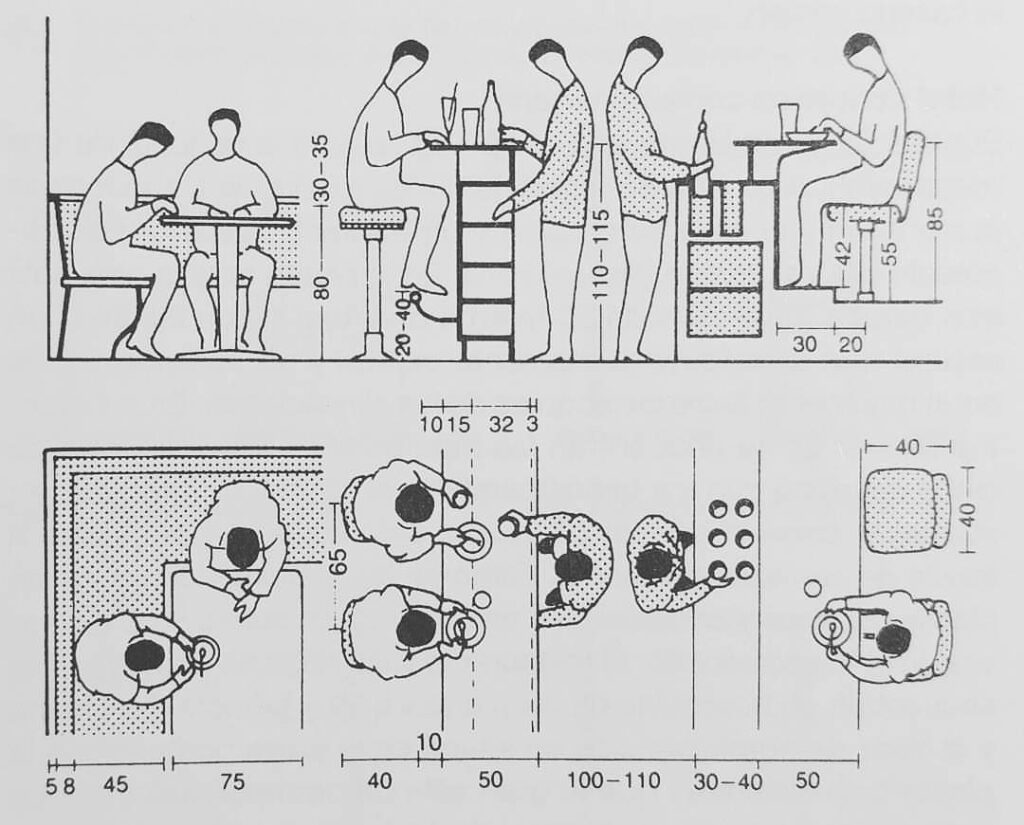 - Автопатот за келнери (90 – 120 cm): главните патеки во ресторанот не смеат да бидат тесни грла. За еден келнер со послужавник да помине безбедно покрај гостите, потребен е простор од минимум еден метар.