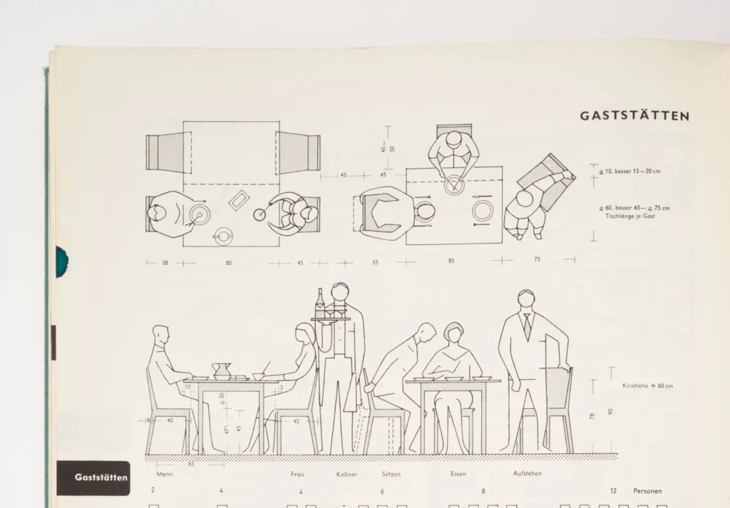 Ернст Нојферт бил германски архитект кој сфатил една едноставна работа: луѓето имаат специфични димензии и се движат на предвидлив начин. Тој ја формулирал една од наједноставните, но најважни идеи во архитектурата: просторот мора да се мери според човекот, а не обратно. Неговата книга „Architects’ Data“ не е само збирка табели — таа е практичен водич за тоа како луѓето седат, се движат, комуницираат и работат во реални услови. Кога архитект проектира ресторан, тој не црта „од око“ – тој го користи Нојферт за да се осигура дека вие ќе имате доволно воздух додека јадете.