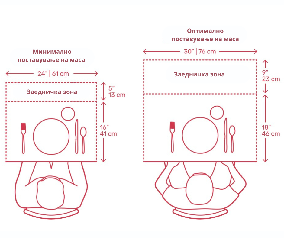Лична зона: 41 cm (16″) – простор за прибор и чинија.
