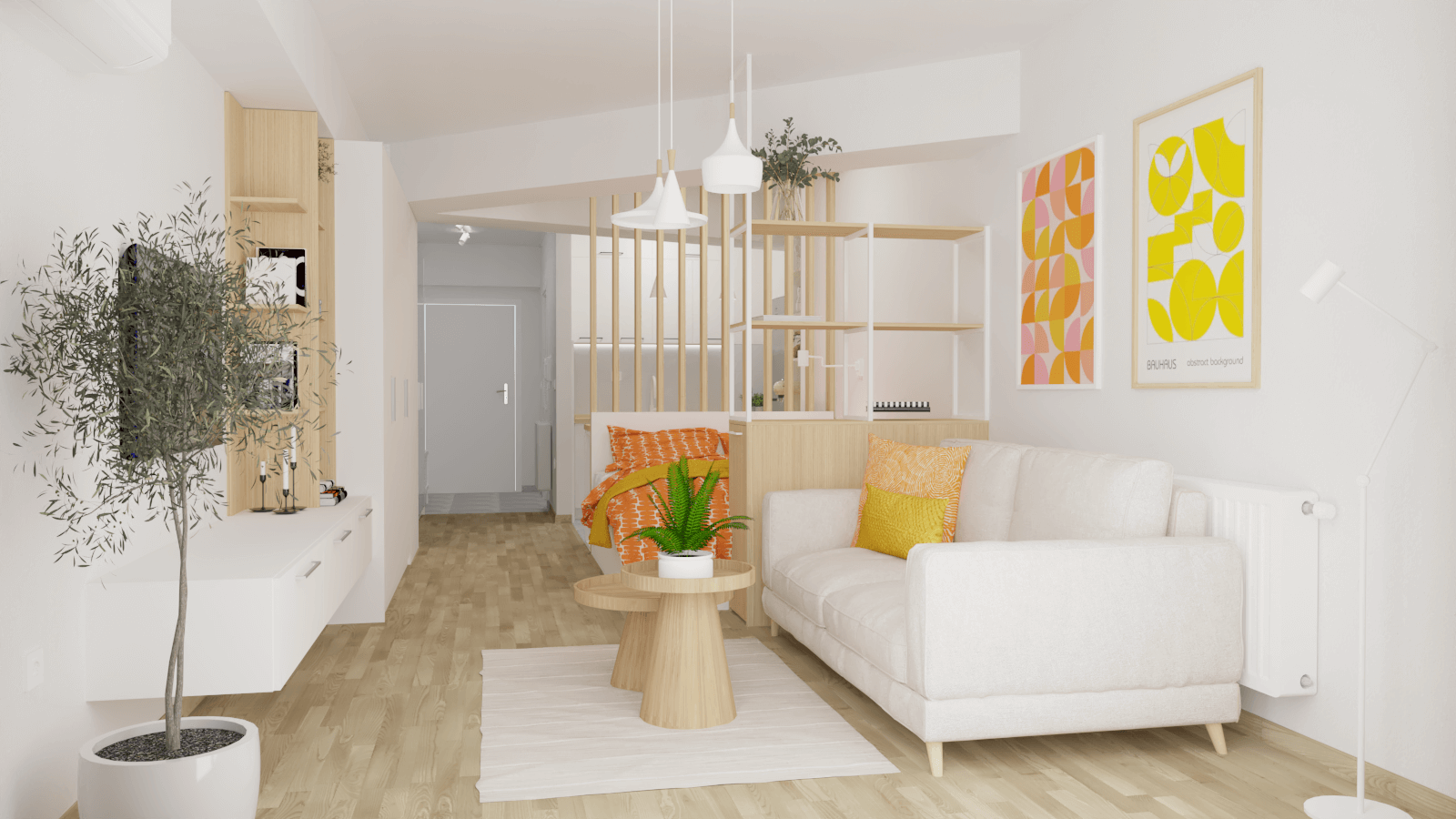 A neutral base is combined with warm wood elements and subtle accents in orange and yellow tones, adding character without limiting future tenants. The design focuses on practicality, easy maintenance, and flexible everyday use.