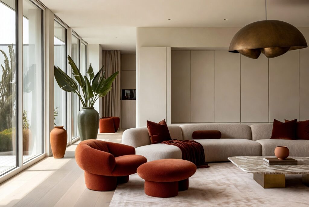 | Мебел | Чисти линии + скулптурални, заоблени форми (fat furniture) | Едноставни, функционални, прави линии | Скулптурални, артистички форми | Култни, органски, ниски форми | Минималистички, ниски, природни |
