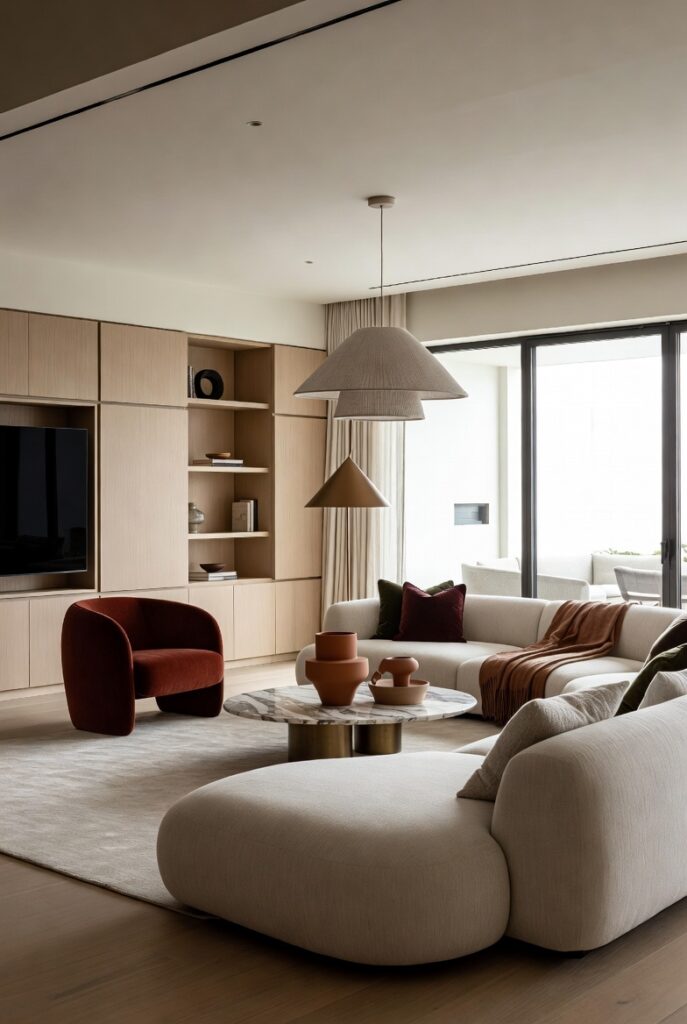 Острите агли се минато. Скандиталиан го дефинираат заоблените каучи, кружните огледала, лачните врати и органски оформените маси. Секоја форма треба да ги следи природните линии, нема место за ригидни правоаголници кои ладно го сечат просторот.
