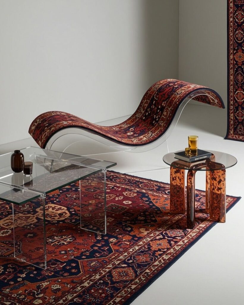 1. Контраст на материјали: поставете го финиот свилен Наин тепих врз мермерен под или покрај стаклени масички. Ладното стакло и топлата свила создаваат совршен баланс.